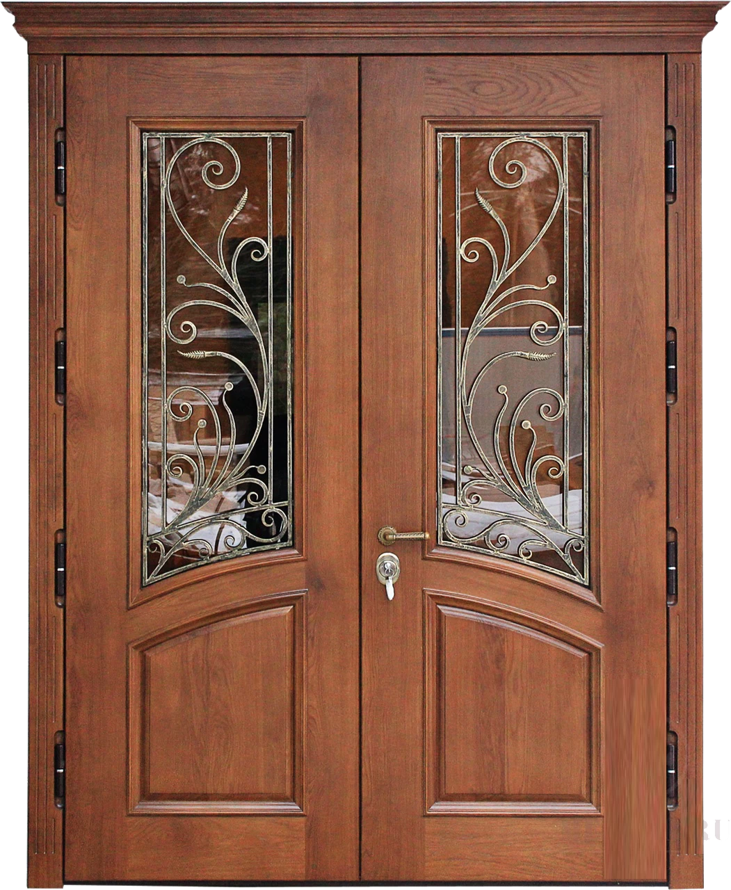Поговорим об отделке. Вариантов декора дверей много. В большинстве случаев, для отделки элитных дверей используется массив натурального дерева или натуральный шпон с фрезеровкой. Цвет двери так же делается по желанию заказчика. Очень красиво и представительно выглядят двери с ковкой и стеклом.